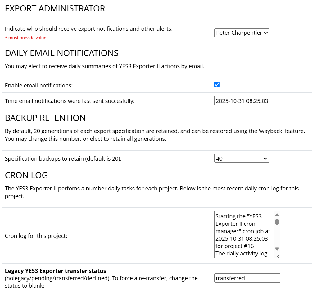 Specifies the user who will receive all email notifications generated by the YES3 Exporter. In addition, this user account is associated internally with automated daily runs or 'cron jobs'. Typically this is a data manager or project director. This is a required setting.