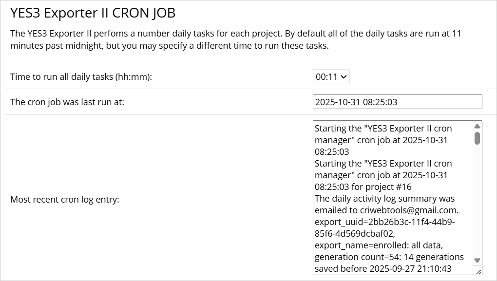 The YES3 Exporter performs automated daily tasks, such as removing old export backups and emailing activity reports. By default, daily housekeeping tasks are run at 11 minutes past midnight (server time), but an administrator can specify a different time to run these tasks.