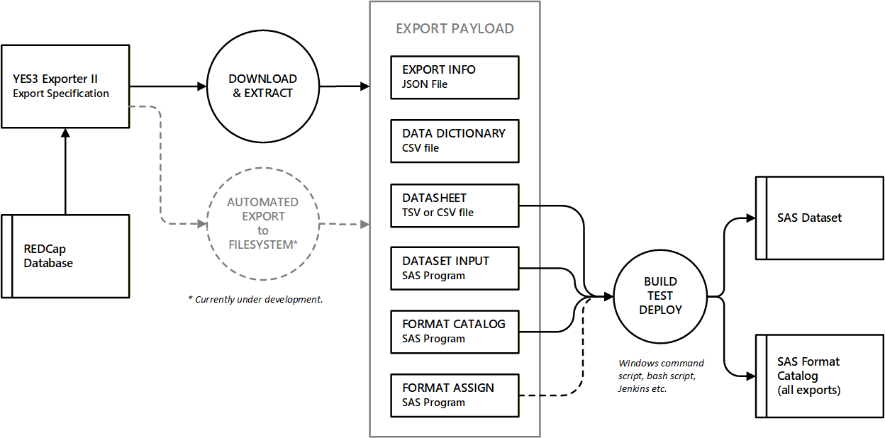 The following diagram shows how YES3 Exporter II can be used in a build-test-deploy pipeline. At the current time, this process cannot be totally automated, as user action is required to download the zipped export payload, and to extract it into the appropriate secure file location. Full automation will be supported in a future release.