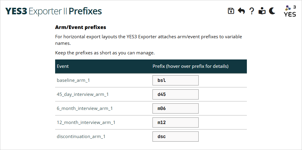 If you do not enter your own custom event prefixes using the YES3 Exporter II Event Prefixes plugin, default prefixes will be used. We strongly recommend that you make up your own custom prefixes. See the SAS variable names topic in the Generated SAS Code section for a more thorough discussion of the implications of event prefixes on export column names.