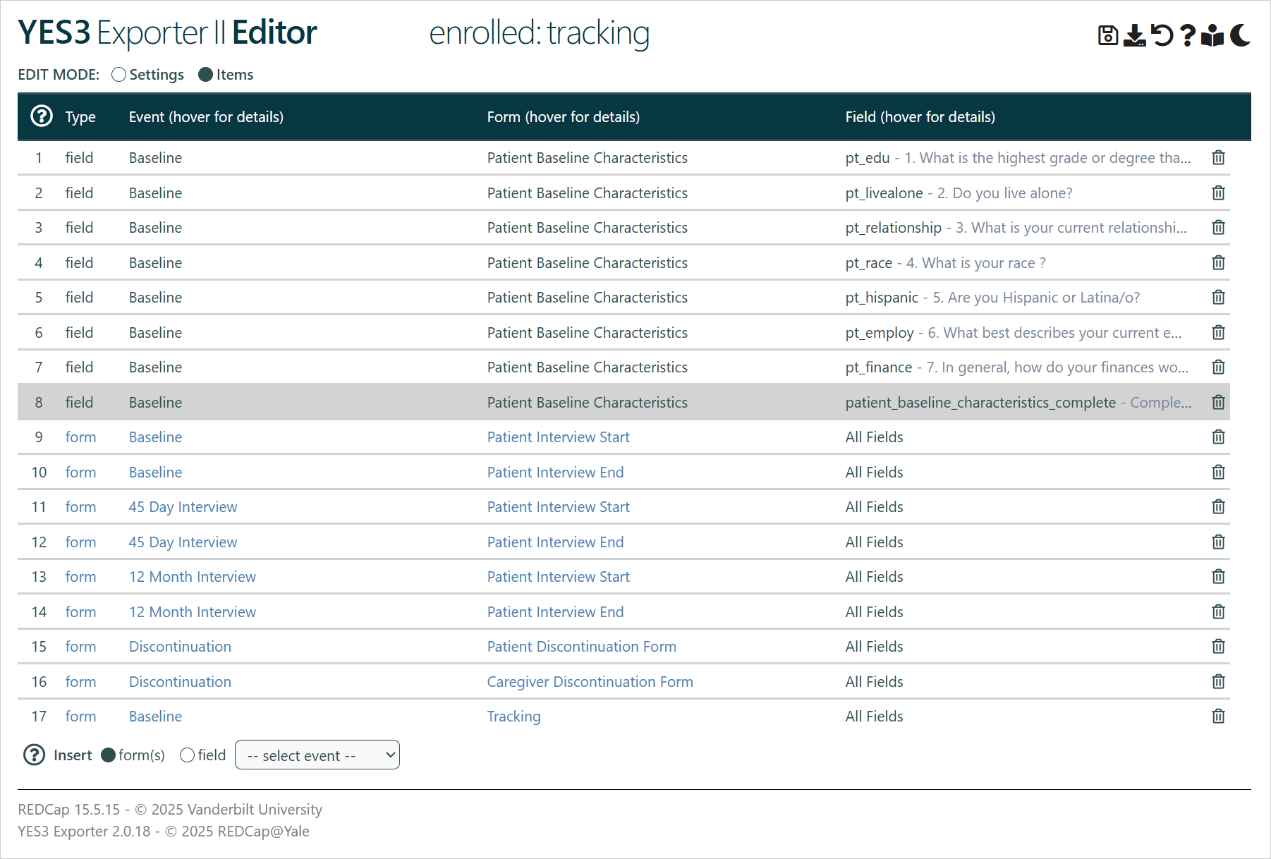 Export items are the forms and fields to include in the export. An export may include any number of form and/or field items, and each item can be specific to an event.
