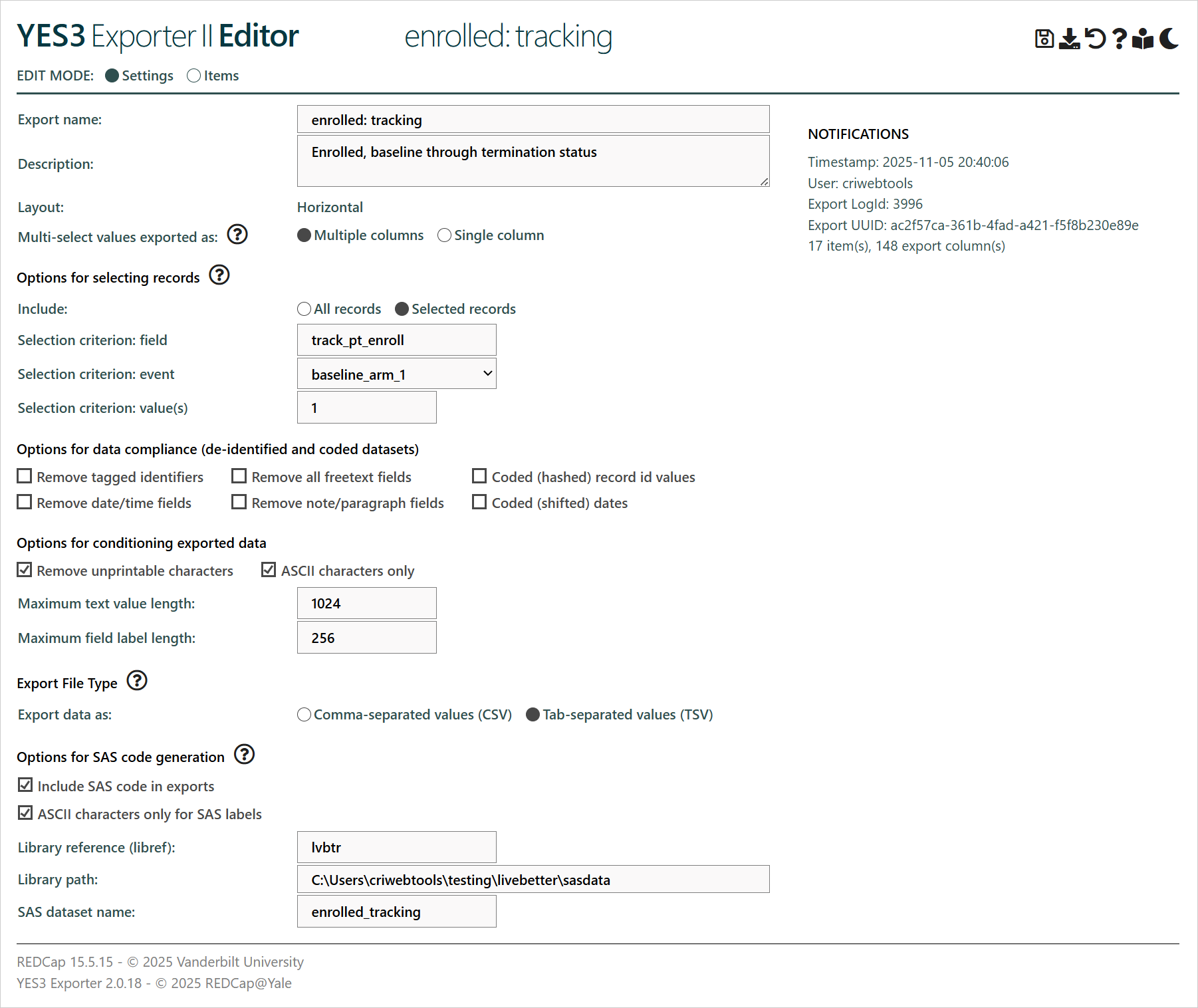 As the tool for editing export specifications, the YES3 Editor is the workhorse of YES3 Exporter II. It is loaded from the Export Manager, and opens into a separate browser window or tab. There are two components to the export editor, called settings and items, selectable by a radio button control at the top left of the page.